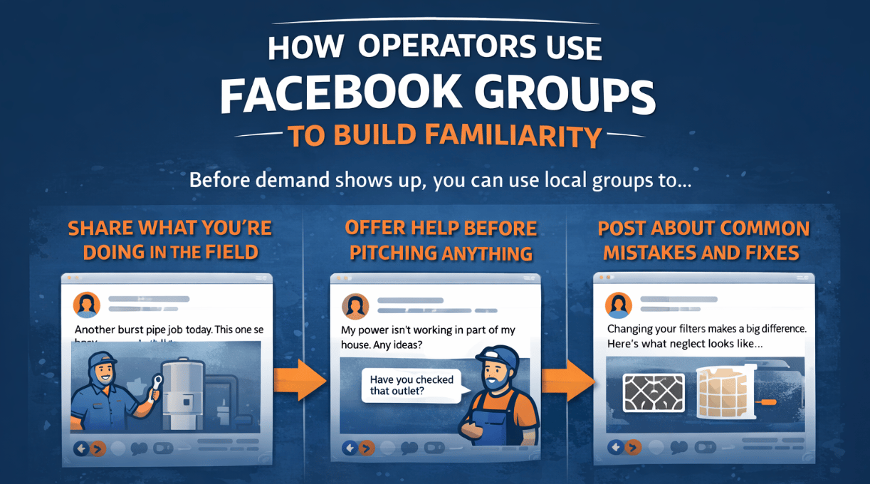 The mistake most operators make is treating groups like another ad placement. The operators who win treat them like a community. They show up without pitching, tell a consistent story, and build familiarity long before a homeowner needs help.