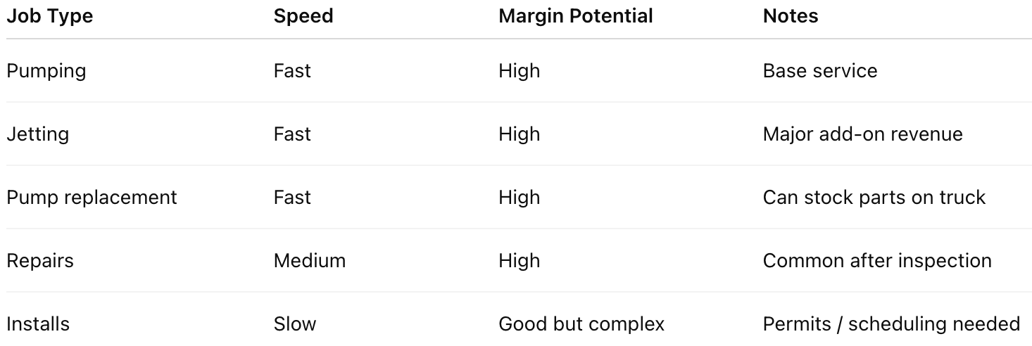 Ticket size can also add up quickly. Pumping jobs may start in the hundreds, but repairs, jetting, and system work can push the average visit much higher. In some cases, the goal is to average $1,000 or more per stop, with additional revenue coming from maintenance, repairs, or replacements identified during the visit.