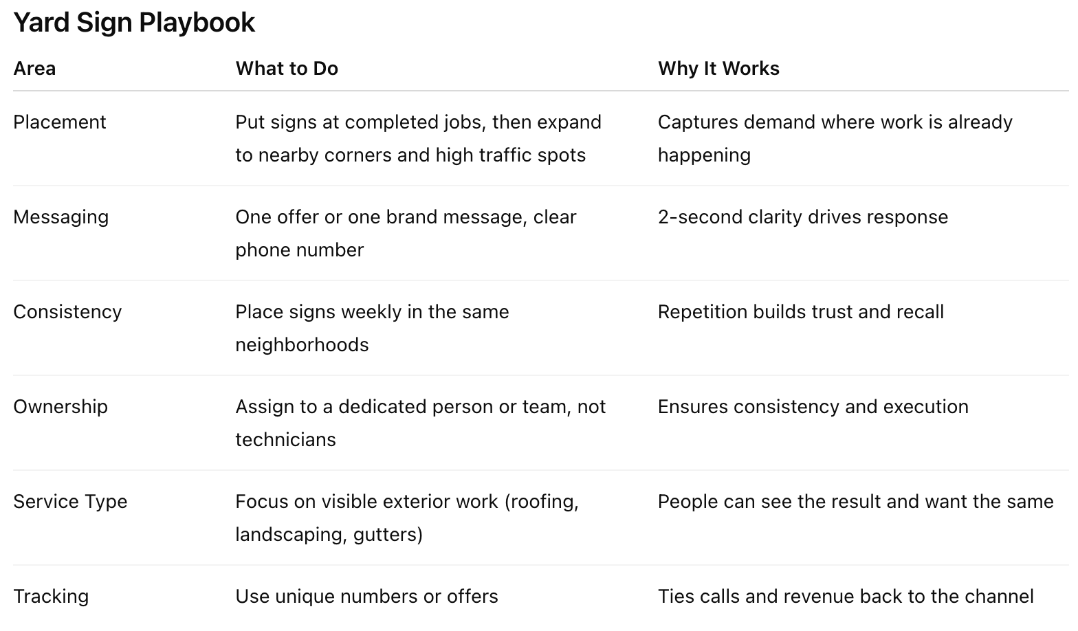 Start with placement. Yard signs perform best when they are tied to real jobs in the neighborhood. Every completed job is an opportunity. Ask to place a sign in the yard, then expand out to nearby corners, entrances, and high traffic streets. The goal is to be seen where the work is already happening.