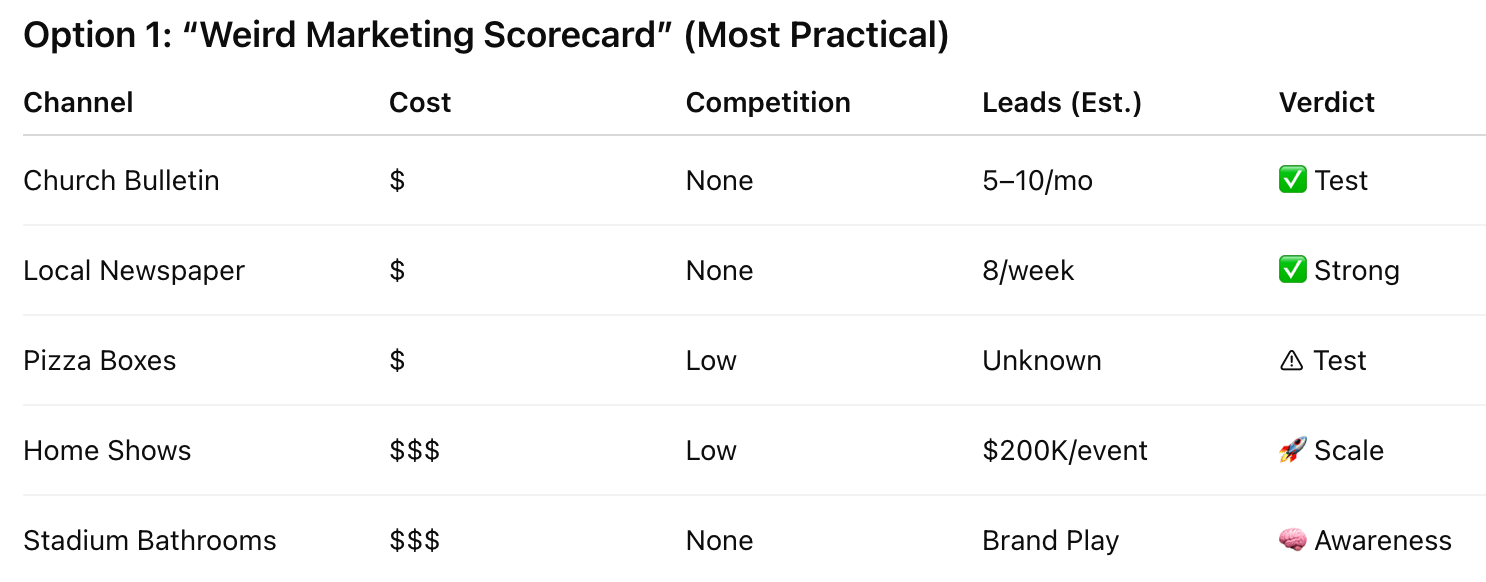 Start with cheap, low-risk tests: Pick 2–3 channels you can enter for under $500. Good starting points are church bulletins, local newspapers, school programs, pizza boxes, or a small event sponsorship. Run each test for 60–90 days. You are not looking for perfection. You are looking for signal.